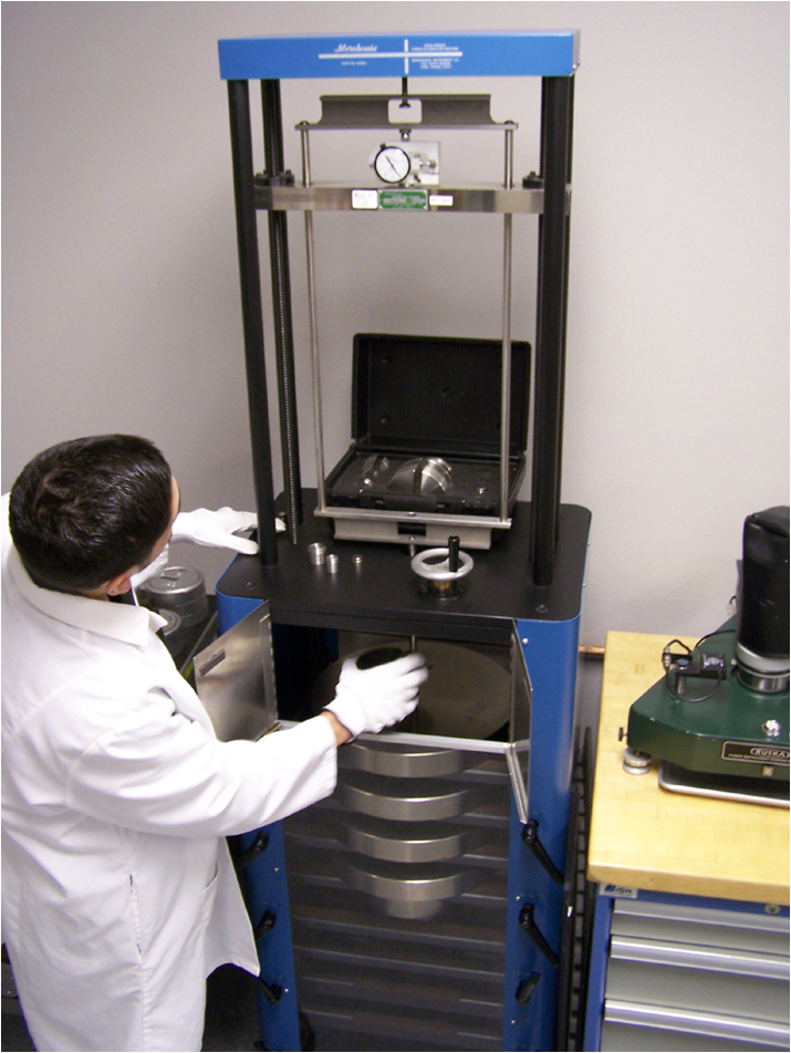 We repair and calibrate all makes and types of force measuring equipment from 0 to 500 lbf  with the Morehouse dead weight primary standard force machine.